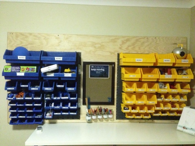 Then up went a board so I could attach various storage and change it around as he gets older without damaging my wall too much. The far left Blue row is for electrical and robotic components which he uses to make things of his own creations, next Blue row is for current projects that he is professing though. Then we have a pin board that he can put instructions on, that way the book isn't taking up table space where he is working. The yellow rows are for all things science and insect related.